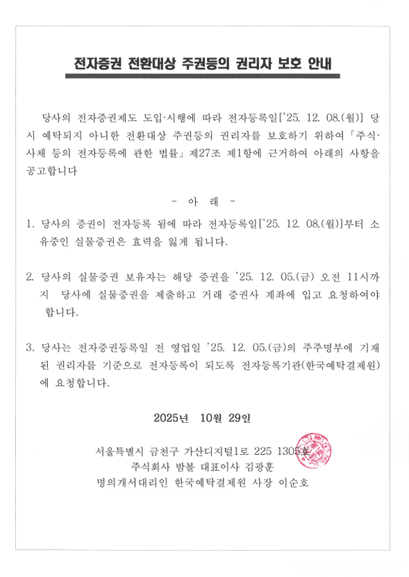 당사의 주식은 12월08일 전자증권으로 전환 됩니다. 권리자 보호에 따른 안내문 공고 드립니다.